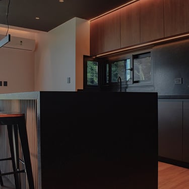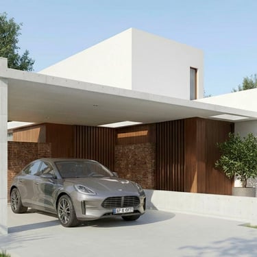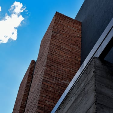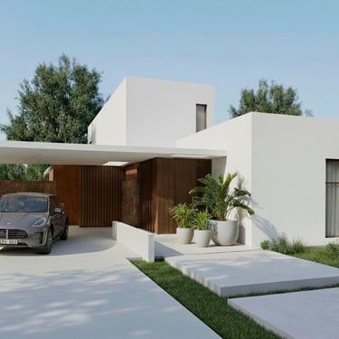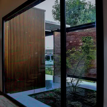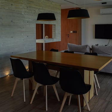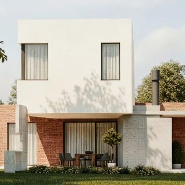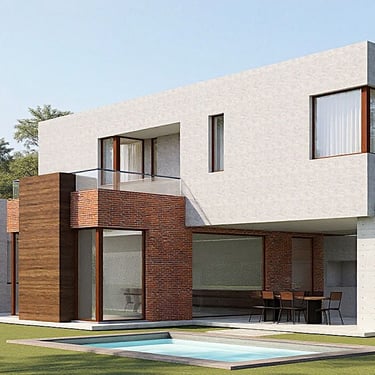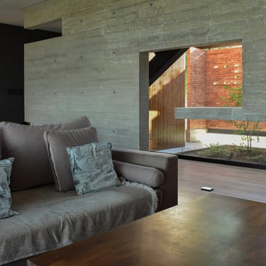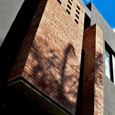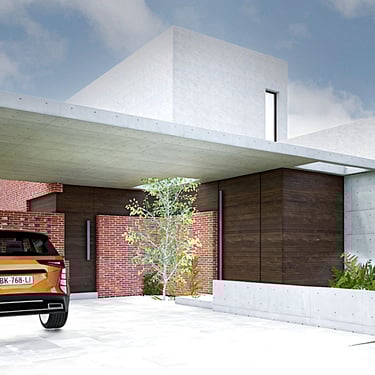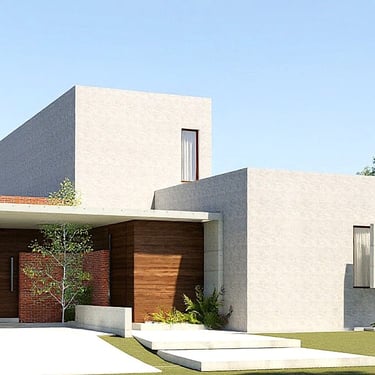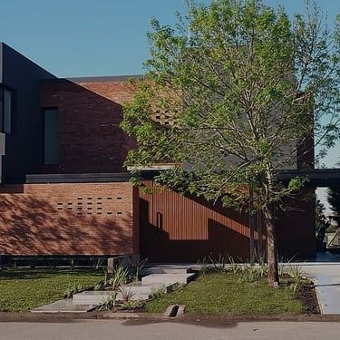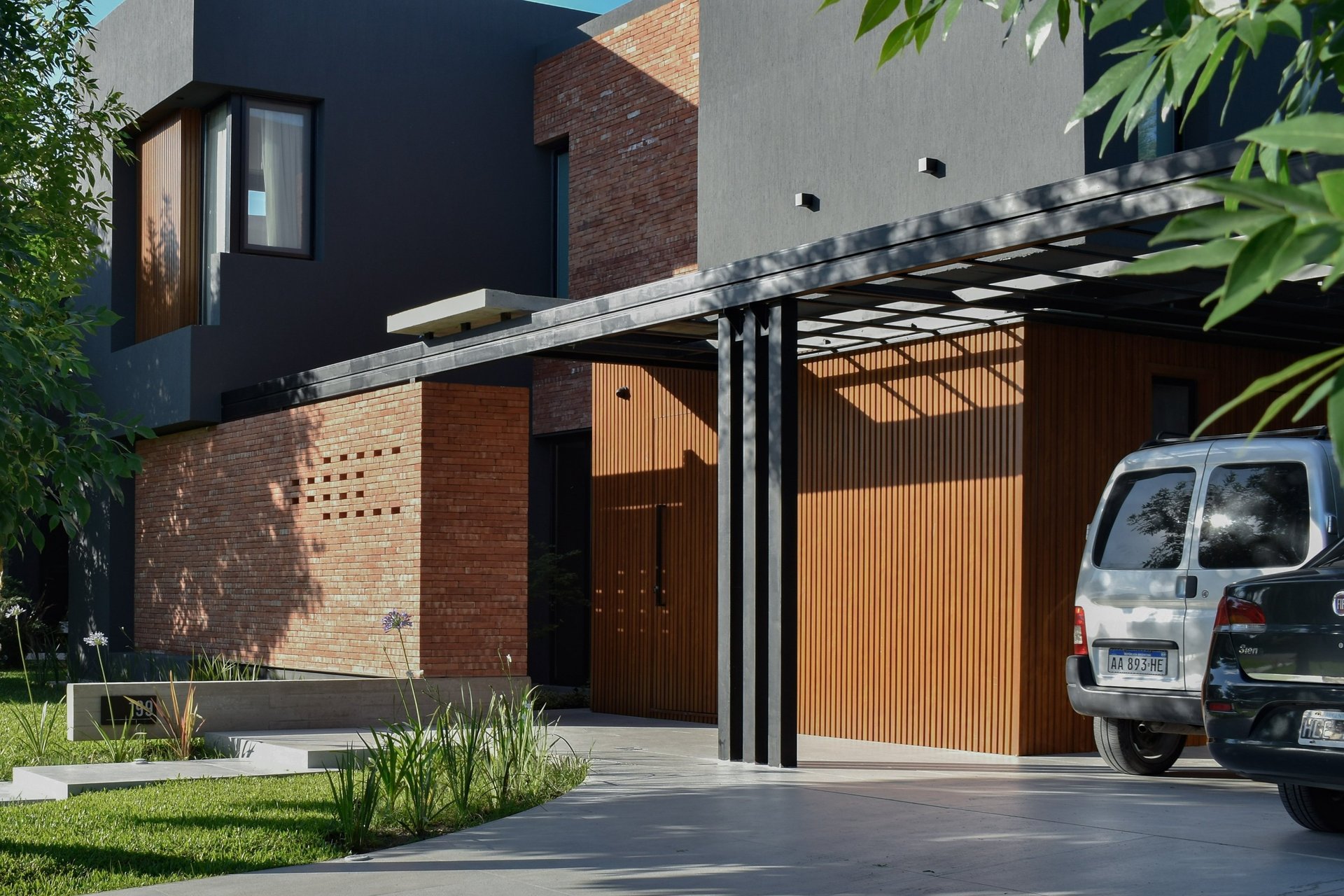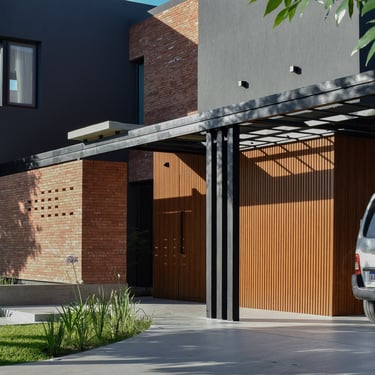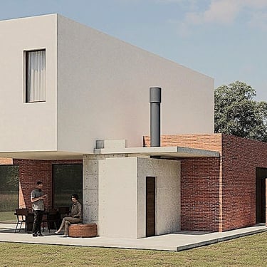 MATERIA: Las áreas privadas se materializan como dos cajas terminadas con revestimiento texturado color blanco tiza. El perímetro del área social está conformado por mampostería de ladrillo visto y revestimiento de WPC símil madera, del mismo tono que las carpinterías exteriores. Las columnas y la losa que definen la cochera son de hormigón visto, al igual que algunos otros elementos presentes en el conjunto.