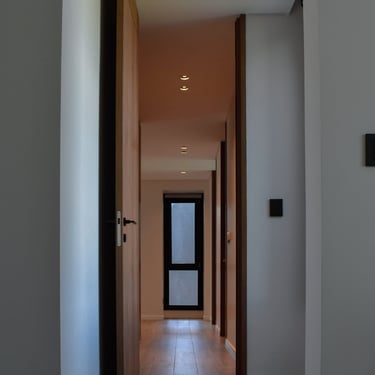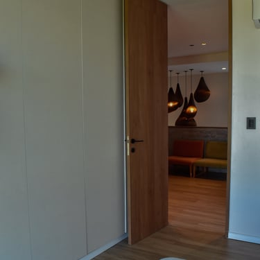MATERIA: En el exterior, un macizo blanco que se articula en función de las tramas mencionadas, es el protagonista material principal de la propuesta. Tres piezas revestidas en WPC y unos pocos elementos revestidos en piedra, generan un contraste de textura y color que enfatiza la articulación volumétrica. En los espacios interiores predominas los materales detonos claros y cálidos, mientras que un revestimiento de madera quemada aplicado a algunas superficies, aporta una textura y tonalidad contrastante que genera un contrapunto con la ambientación general.