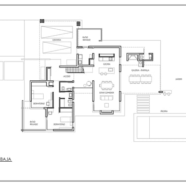 FUNCION: La propuesta funcional tiene como punto de partida una configuracion base, que puede ser adaptada según las necesidades del futuro usuario. El área social conformada por espacios cubiertos y semicubiertos actúa como punto de reunión familiar. Las dos áreas privadas dispuestas en diferentes plantas, permiten distintas conformaciones. Inicialmente se plantean en planta baja las habitaciones para hijos y en planta alta la habitación y el estudio para padres; pero el esquema permite una amplia versatilidad sin alterar la propuesta general.