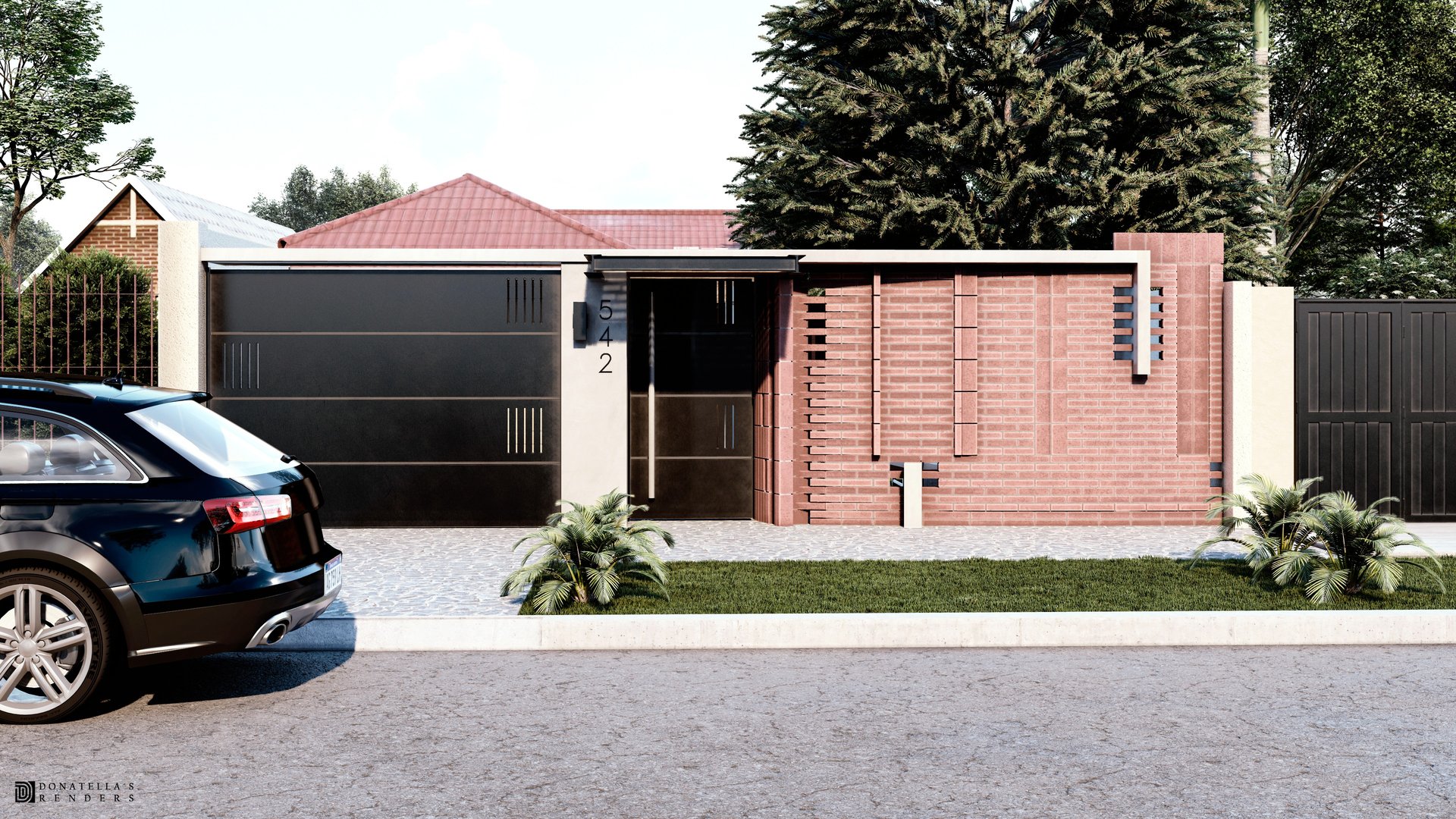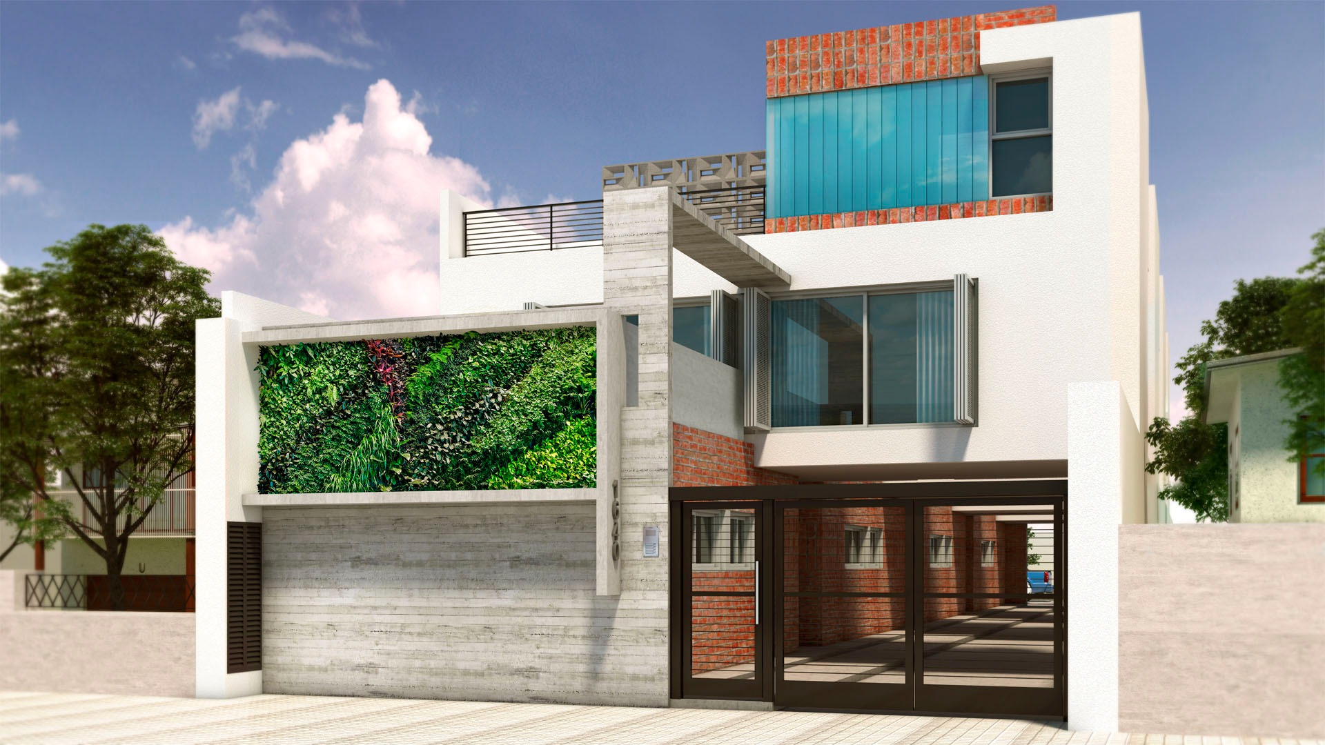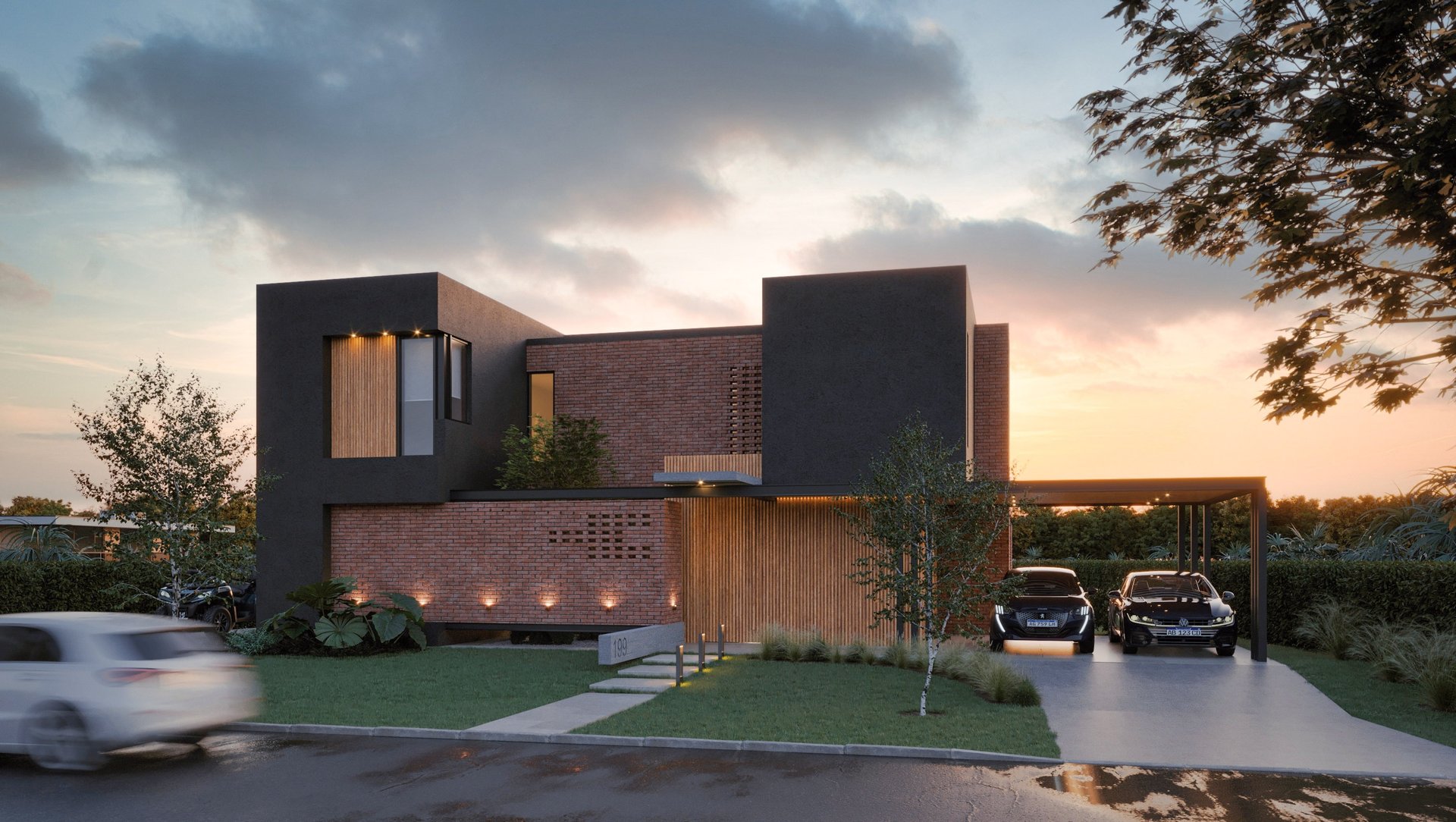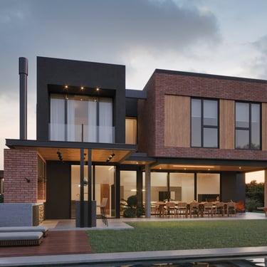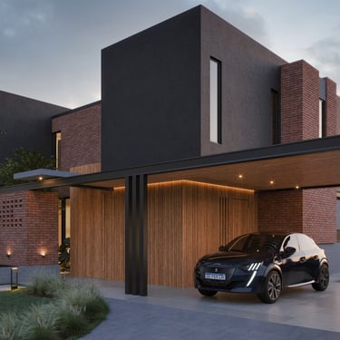 MATERIA: Para el volúmen macizo, se planteó el uso de ladrillo visto, revestimiento texturado, madera y detalles en hormigón visto. En las estructuras complementarias (cochera-parrilla) predominasn la perfilería de hierro y la madera. En los interiores, pisos de porcellanato y enlucido de yeso en paredes dan unidad a la propuesta, dejando espacio para detalles en madera y hormigón visto. En resúmen, una paleta de materiales nobles que establezcan diálogo con el entorno verde circundante.