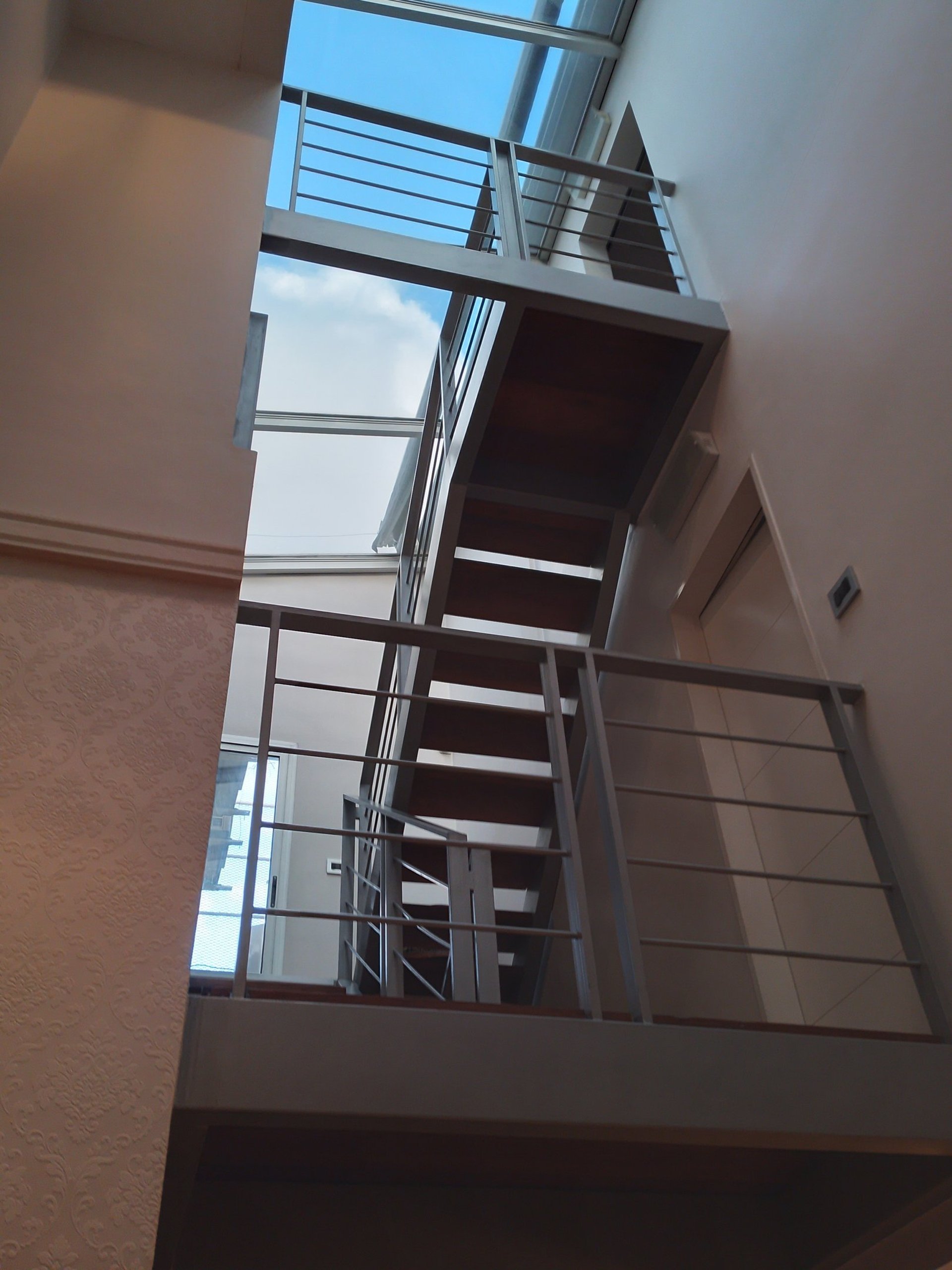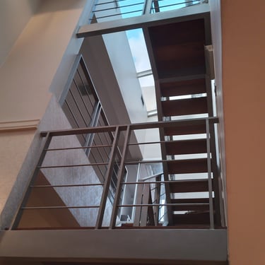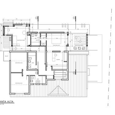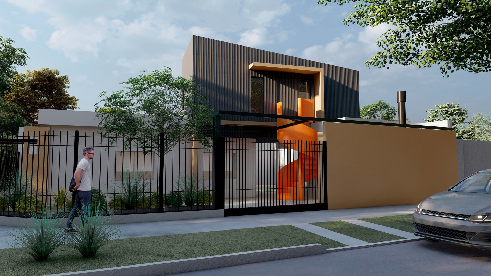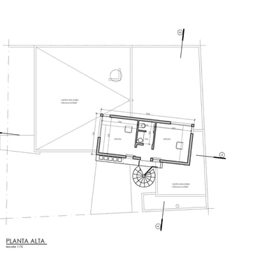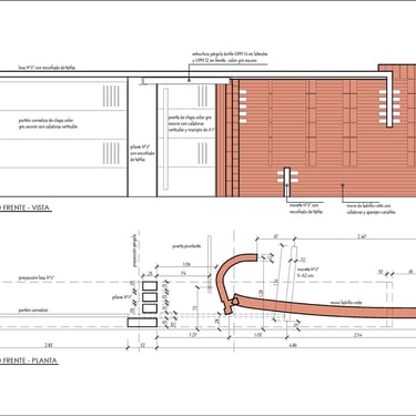MATERIA: La planta baja se plantea como una construcción tradiciones con mampostería terminada con revestimiento texturado, el cual se replica en la vivienda existente para unificar el conjunto. La planta alta en cambio, se propone como un volúmen ejecutado con sistema de construcción en seco, terminado en todos sus cerramientos con chapa acanalada color negro; y junto a la escalera también metálica, acentúan su contraposición con la planta baja.