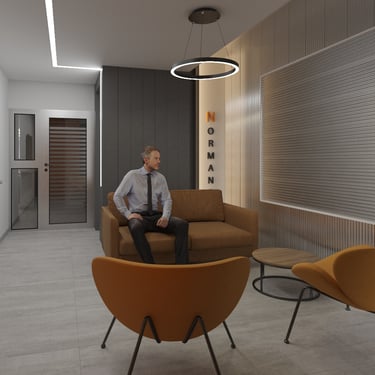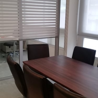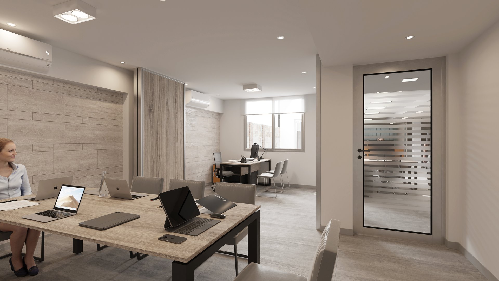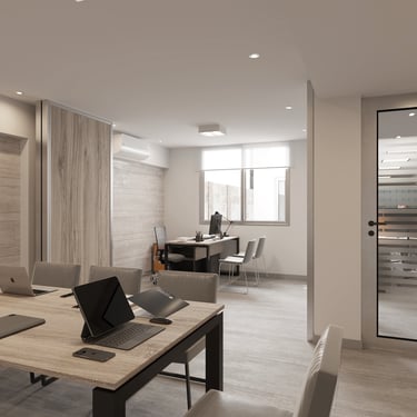 MATERIA: La materialidad de los espacios interiores, tiene como elementos predominantes el piso de porcellanato de grandes dimensiones que unifica todos los espacios, y una serie de revestimientos que cualifican las distintas áreas; madera con las mismas terminaciones que los muebles en las oficinas generales, travertino en el privado y la sala de reuniones, y metal en el sector de ingreso interior-exterior. En el frente, se trabajó con una composición en base a revestimientos texturados y metal, y se intervinieron las rejas existentes en el frentear lograr al mmo tiempo, mayor privacisasd y una imágen más contemporánea.