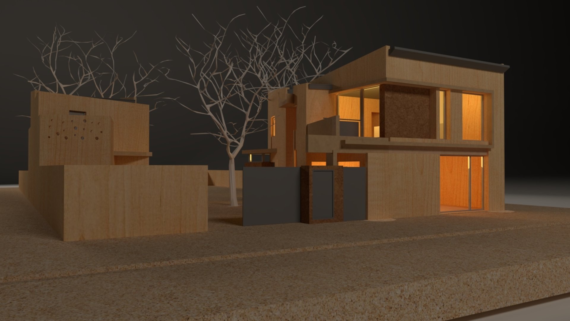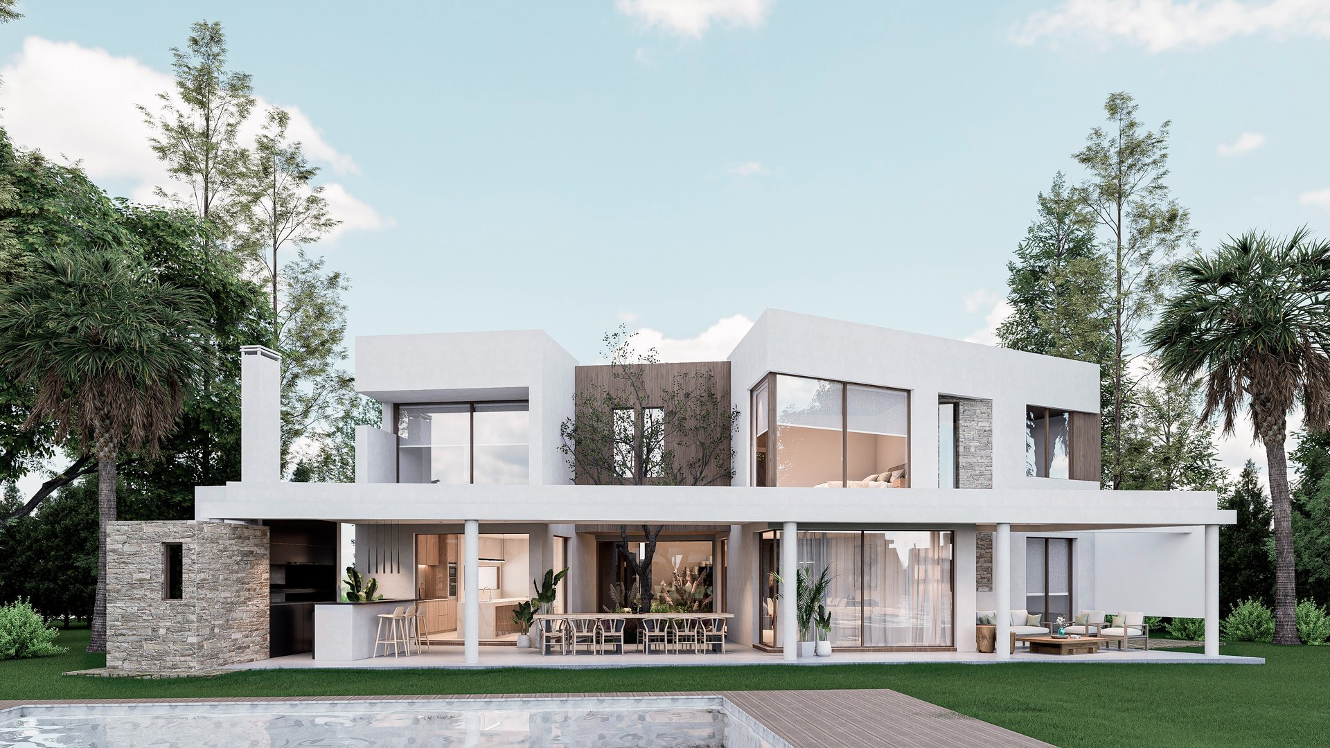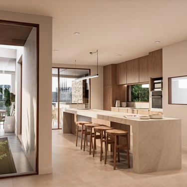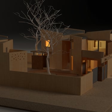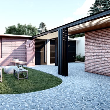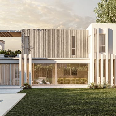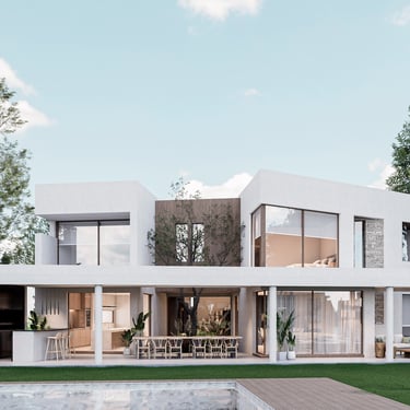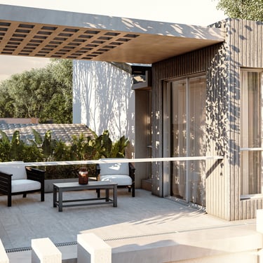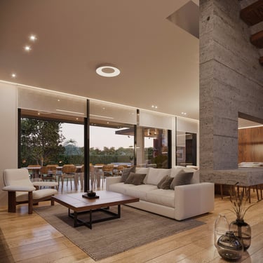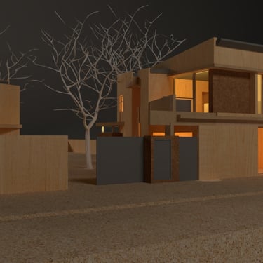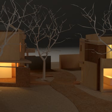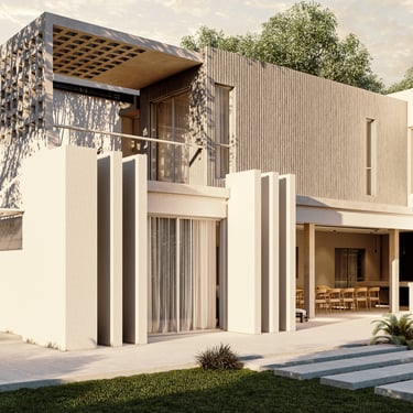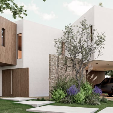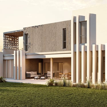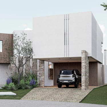 MATERIA: La materialidad de la obra está planteada utilizando materiales nobles. El hormigón visto, la piedra y el revestimiento texturado, conforman una paleta natural que se vincula con la arboleda existente. Los espacios exteriores combinarán caminos vehiculares de piedra suelta y accesos a las viviendas en madera dura.