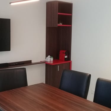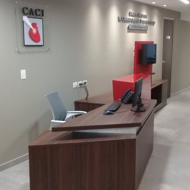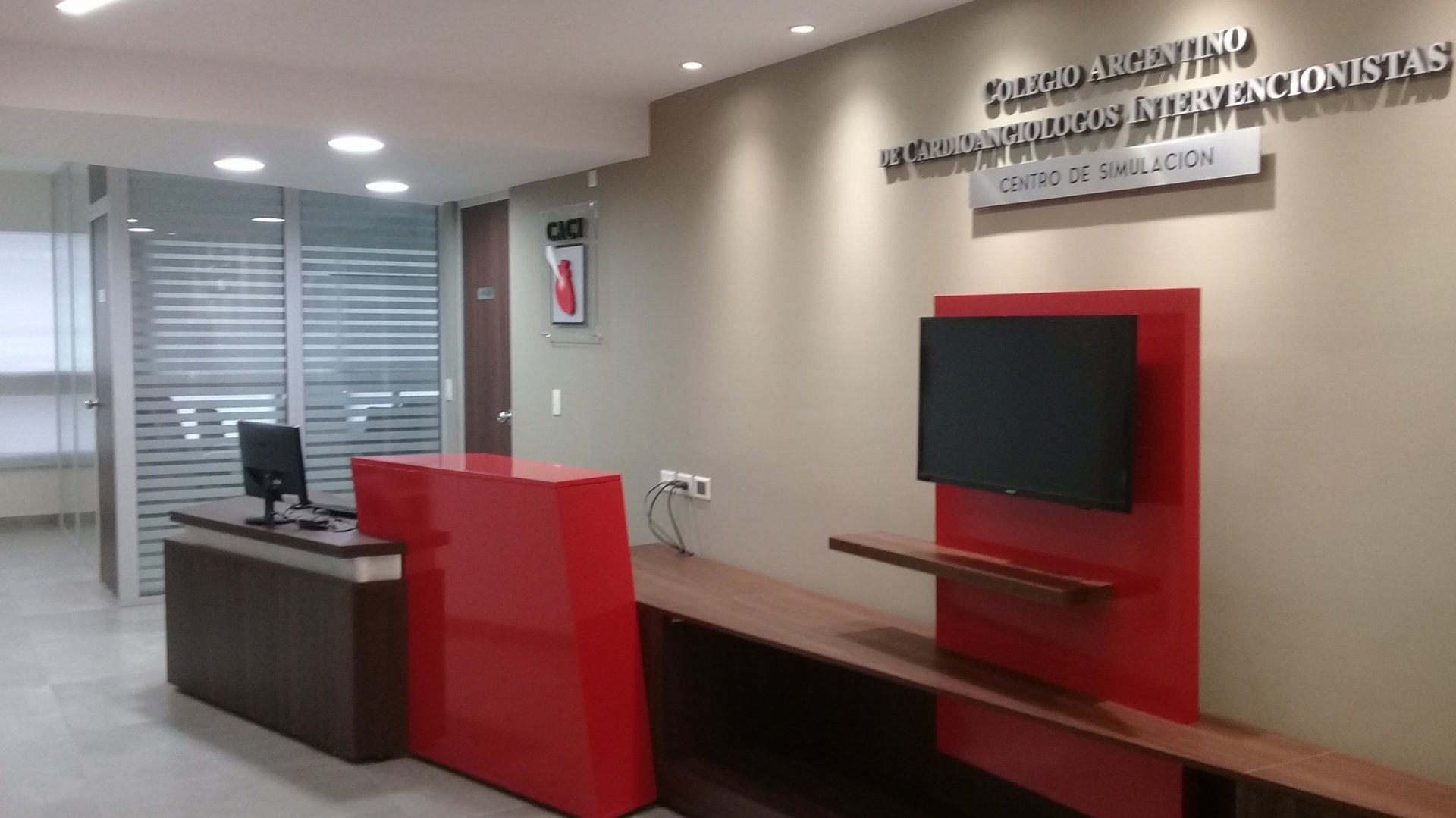 MATERIA: La obra fue ejecutada utilizando una paleta acotada de materiales. El piso de porcellanato gris actúa como elemento unificador. Las tabiquerías fueron resueltas con paños opacos de durlock y transparentes de carpintería de aluminio y vidrio, acordes a las necesidades de los distintos espacios. Los colores elegidos fueron neutros, con alteraciones puntuales en tonos de rojo; color presente en la identidad del C.A.C.I.