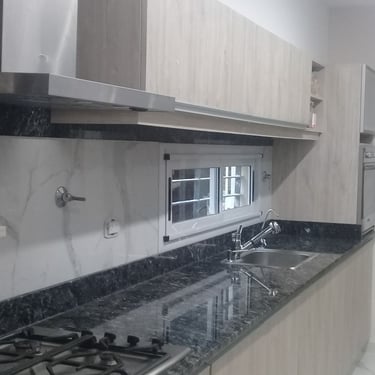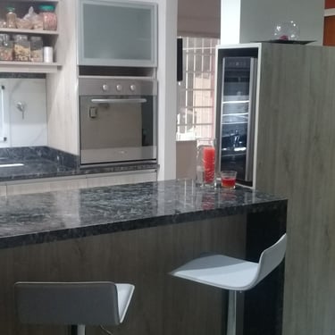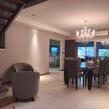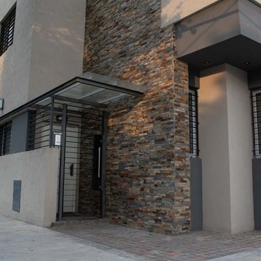 MATERIA: La construcción, de carácter tradicional, se materializa con estructura de hormigón armado y mampostería de ladrillos huecos con terminación exterior de revestimiento texturado tanto en frente como en contrafrente. En los interiores, pisos de porcellanato en las áreas sociales, se combinan con maderas en escaleras y en los pisos de las habitaciones. En ciertos sectores del estar y del comedor principal, el revestimiento de piedra aporta la rusticidad propia de los elementos naturales, en contraste con las paredes terminadas con latex satinado de tonos neutros.