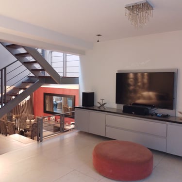 FORMA: A partir de una premisa de los comitentes que consistía en que la vivienda se desarrollara en medios niveles, se planteó un espacio troncal de triple altura en sentido transversal con iluminación cenital, que proporciona un recorrida contínuo por las distintas plantas con un alto grado de luminosidad natural. El área social, a la cual se llega subiendo medio nivel desde el acceso principal o desde la cochera, es la que se integra de manera franca al espacio antes mencionado. A medida que se asciende, los espacios destinados a zonas privadas se vinculan con mayor grado de intimidad. Completa la propuesta, una generosa expansión hacia el jardín posterior.