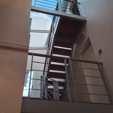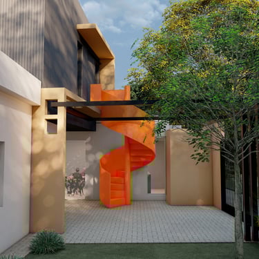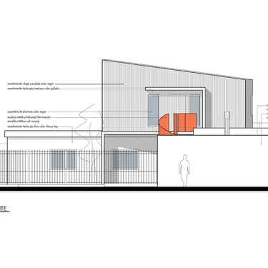 FORMA: La propuesta se trabajó con tres elementos diferenciados. El volúmen destinado a quincho se separa de la vivienda original y se mimetiza con lo existente.Este conjunto, de caracter sobrio, actúa como la base sobre la que destacan las dos piezas protagonistas de la propuesta. Estas dos piezas, conforman el espacio destinado a trabajo. La primera, se materializa mediante una caja metálica que destaca por oposición, de los dos volúmenes de planta baja sobre los que apoya generando un espacio semicubierto de vinculación entre éstos. La escalera de acceso a planta alta es la segunda pieza; la que destaca en el conjunto por morfolog{ia y color.