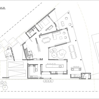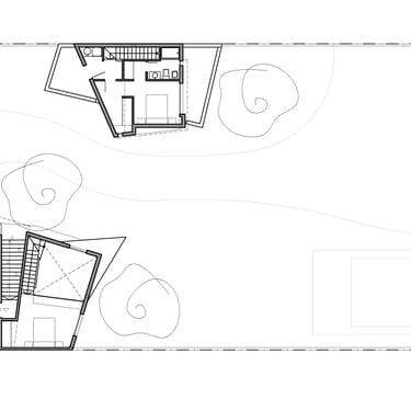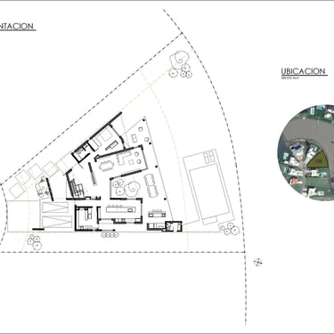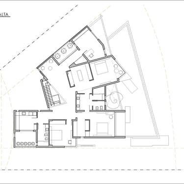 FORMA: La vivienda se plantea a partir de la búsqueda de que la misma se "descubra" a medida que nos acercamos a ella; replicando una condición que es propia del terreno, por su ubicaión dentro del emprendimiento. La forma general de la vivienda acompaña las características de éste. Dos tramas paralelas a cada uno de los ejes divisorios, más una tercera rama intermedia, generan una volumefría que, cerrada hacia el frente, se despliega hacia en contrafrente en busca del mejor asoleamiento y de las mejores visuales.