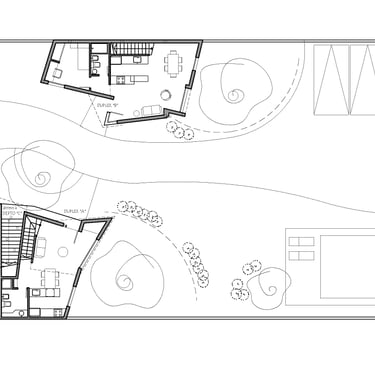 FORMA: La intervención fue abordada tomando como referencia de implantación, tres añosos pinos que daban a la parcela de 800 m2 su carácter especial. Las construcciones, divididas en dos bloques, se alejan de planteos ortogonales y se van acomodando en el terreno acordes a la premisa mencionada. Las formas irregulares resultantes, establecen de esta manera un enriquecedor diálogo entre lo natural y lo artificial.