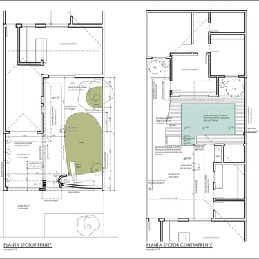 FUNCION: El programa responde a las necesidades de un matrimonio con dos hijas ya independizadas que eventualmente puedan pasar la noche en la vivienda. Así, se desarrolla en la planta baja un área social con expansiones hacia el contrafrente, a la que se suma una habitación de huéspuedes que permite tambien su uso como estudio. En planta alta, el área privada cuenta con dos habitaciones principales con baño suite compartido para el matrimonio; una segunda habitación de huéspedes y un atelier de trabajo. Los servicios se distribuyen en ambas plantas según las necesidades.