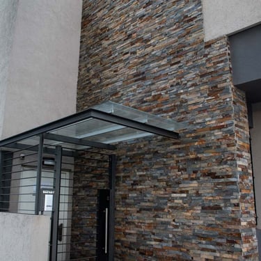 MATERIA: En el interior, se utilizaron materiales de fácil mantenimiento. Porcellanatos y cerámicos cubren la totalidad de los pisos de la vivienda. La fachada se resolvió con revestimiento texturado, donde el plano rehundido unifica su color con las rejas, generando un contínuo donde se alternan llenos y vacíos. El revestimiento de piedra de uno de los muros de la fachada, se replica en espacios interiores y en el patio, como presencia repetitiva dentro del conjunto.
