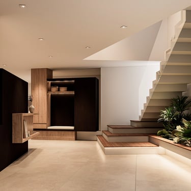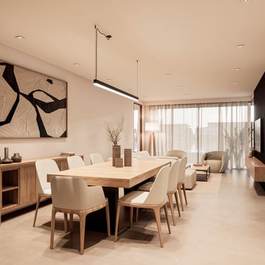 MATERIA: En el exterior, un macizo blanco que se articula en función de las tramas mencionadas, es el protagonista material principal de la propuesta. Tres piezas revestidas en WPC y unos pocos elementos revestidos en piedra, generan un contraste de textura y color que enfatiza la articulación volumétrica. En los espacios interiores predominas los materales detonos claros y cálidos, mientras que un revestimiento de madera quemada aplicado a algunas superficies, aporta una textura y tonalidad contrastante que genera un contrapunto con la ambientación general.